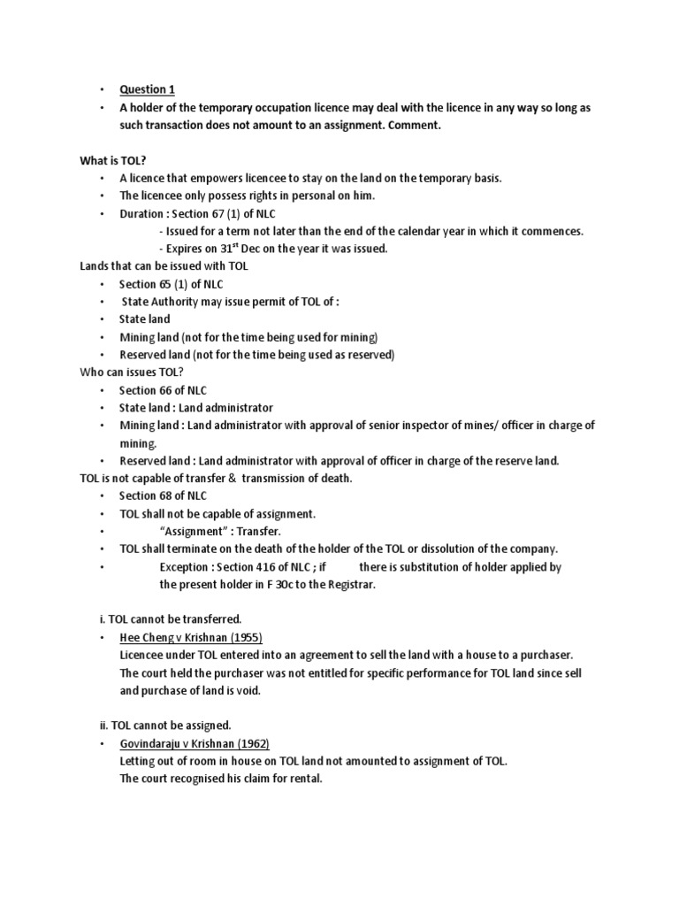 Tol Land Law Docx U2022 U2022 Question 1 A Holder Of The Temporary Occupation Licence May Deal With The Licence In Any Way So Long As Such Transaction Course Hero
