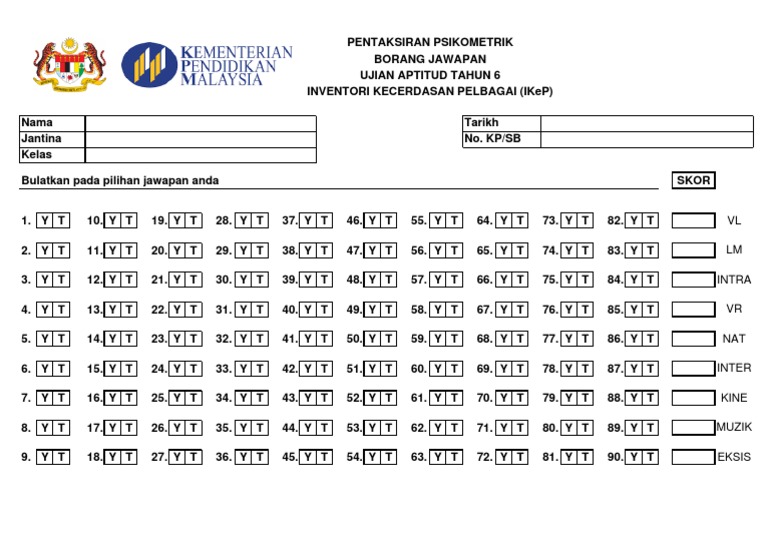 Ujian aptitud tahun 6 inventori kecerdasan pelbagai ikep ujian aptitud tahun 6 inventori kecerdasan pelbagai ikep tarikh. Ikep tahun 6 2016 terhad inventori inventori kecerdasan the words you are searching are inside this book. Contoh operasi dan skor inventori kecerdasan pelbagai tahun 6 format ujian aptitud tahun 2018. 9 00 pagi hingga 9 45 pagi 45 minit sasaran.