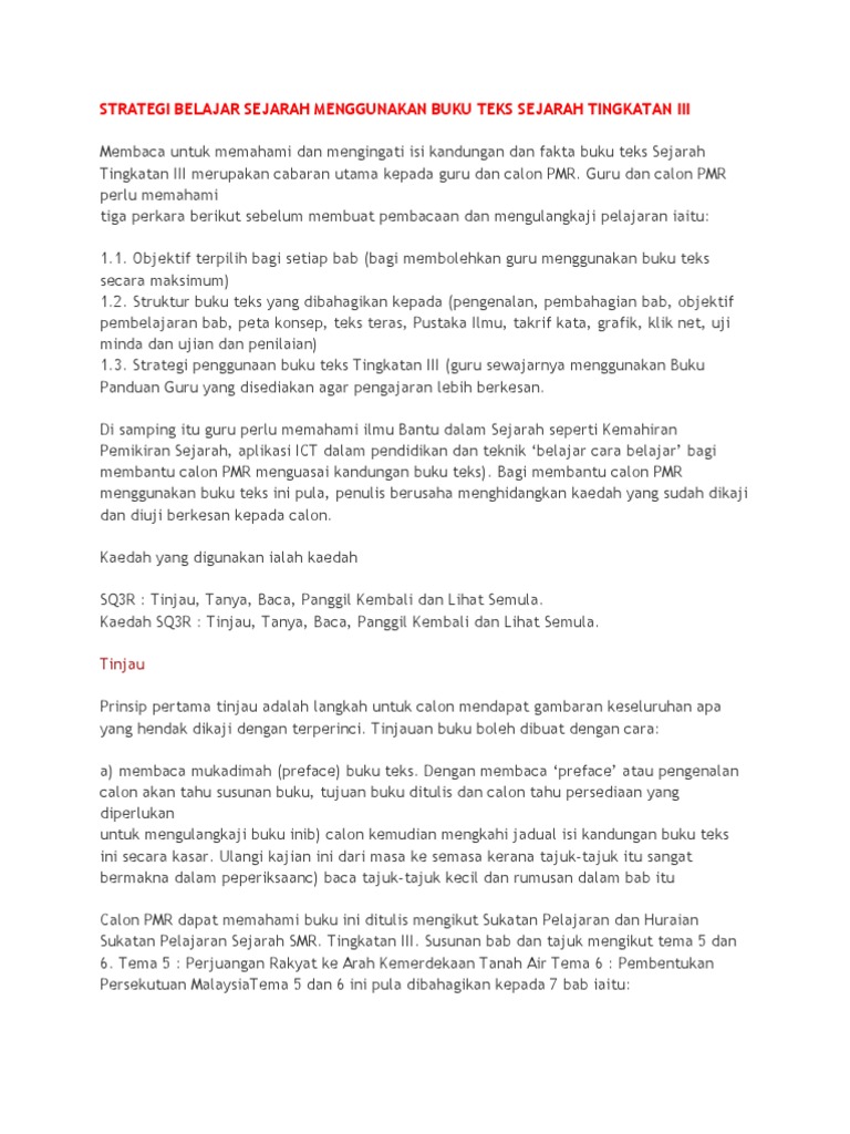 Strategi Belajar Sejarah Menggunakan Buku Teks Sejarah Tingkatan Iii Membaca Untuk Memahami Dan Mengingati Isi