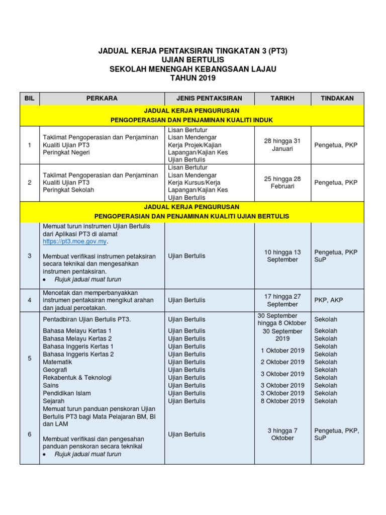 Jadual Kerja Pentaksiran Tingkatan 3 Pt3 Ujian Bertulis Sekolah Menengah Kebangsaan Lajau Tahun 2019
