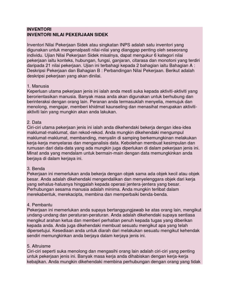 Inventori Nilai Kerjayainventori Nilai Pekerjaan Sidek Atau Singkatan Inps Adalah Satu Inventori Yang Digunakan Untuk Mengenalpasti Nilai Nilai Yang Dianggap Penting Oleh Seseorang Individu Ujian Nilai Pekerjaan Sidek Misalnya Dapat Mengukur 6 Kategori