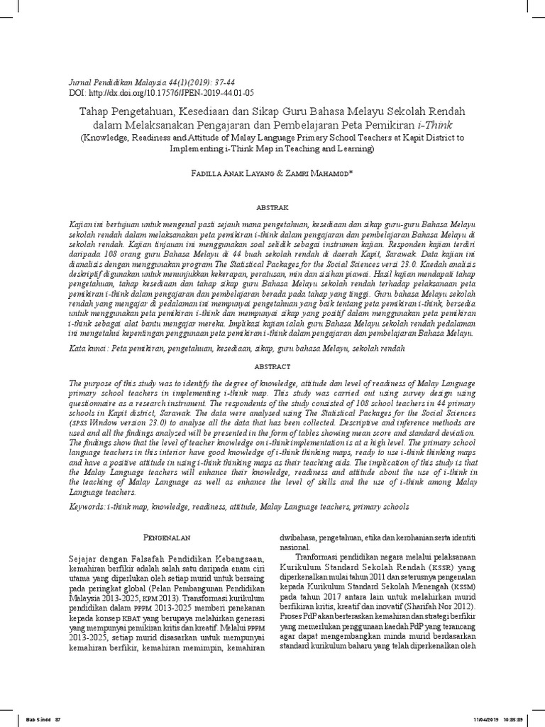 Tahap Pengetahuan Kesediaan Dan Sikap Guru Bahasa Melayu Sekolah Rendah Dalam Melaksanakan Pengajaran Dan Pembelajaran Peta Pemikiran I Think