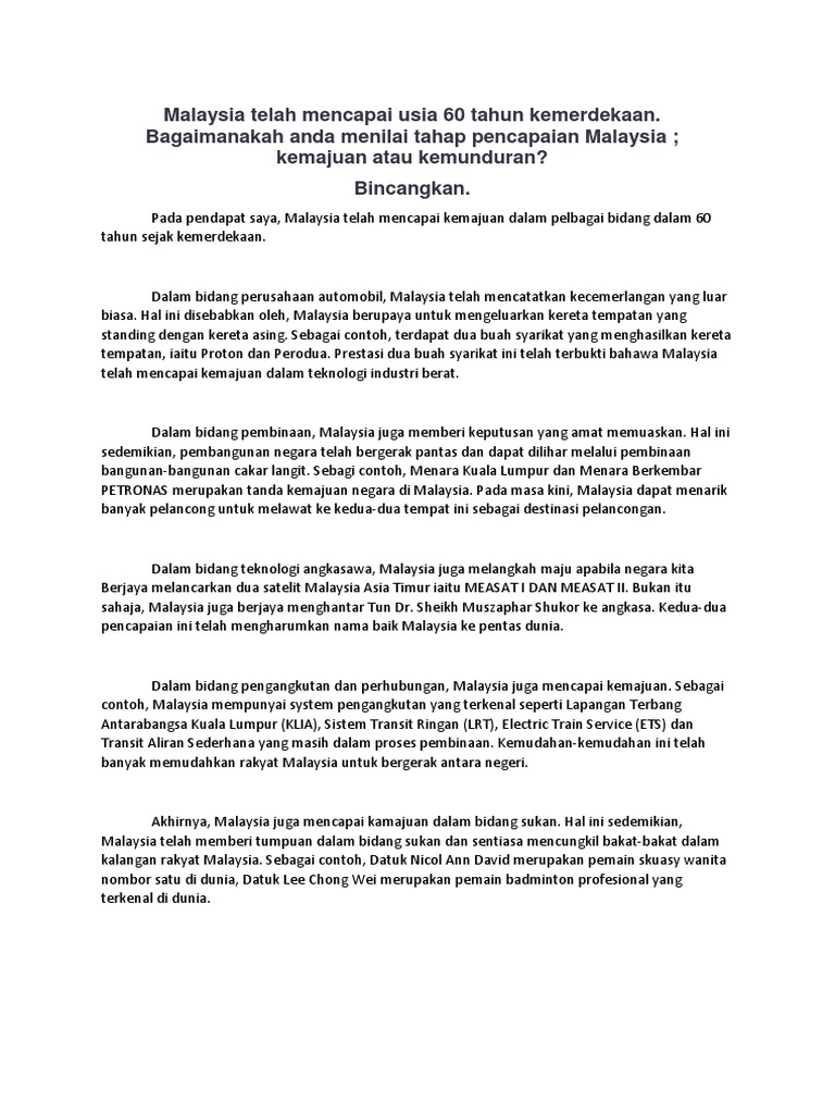 Malaysia Telah Mencapai Usia 60 Tahun Kemerdekaan Bagaimanakah Anda Menilai Tahap Pencapaian Malaysia Kemajuan Atau Kemunduran Bincangkan