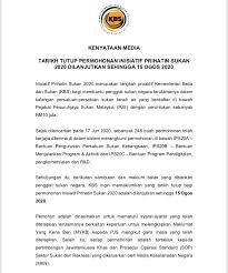 Kbsmalaysia On Twitter Kenyataan Media Kementerian Belia Dan Sukan Malaysia Tarikh Tutup Permohonan Inisiatif Prihatin Sukan 2020 Dilanjutkan Sehingga 15 Ogos 2020 16 Julai 2020 Https T Co Rgrlznh4ua