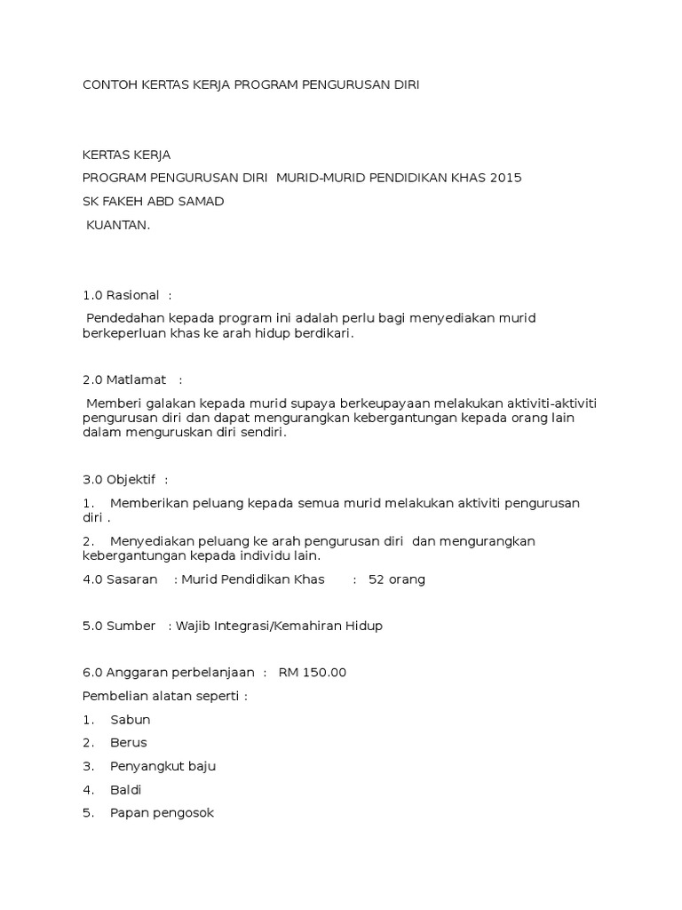 Contoh Kertas Kerja Program Pengurusan Diri
