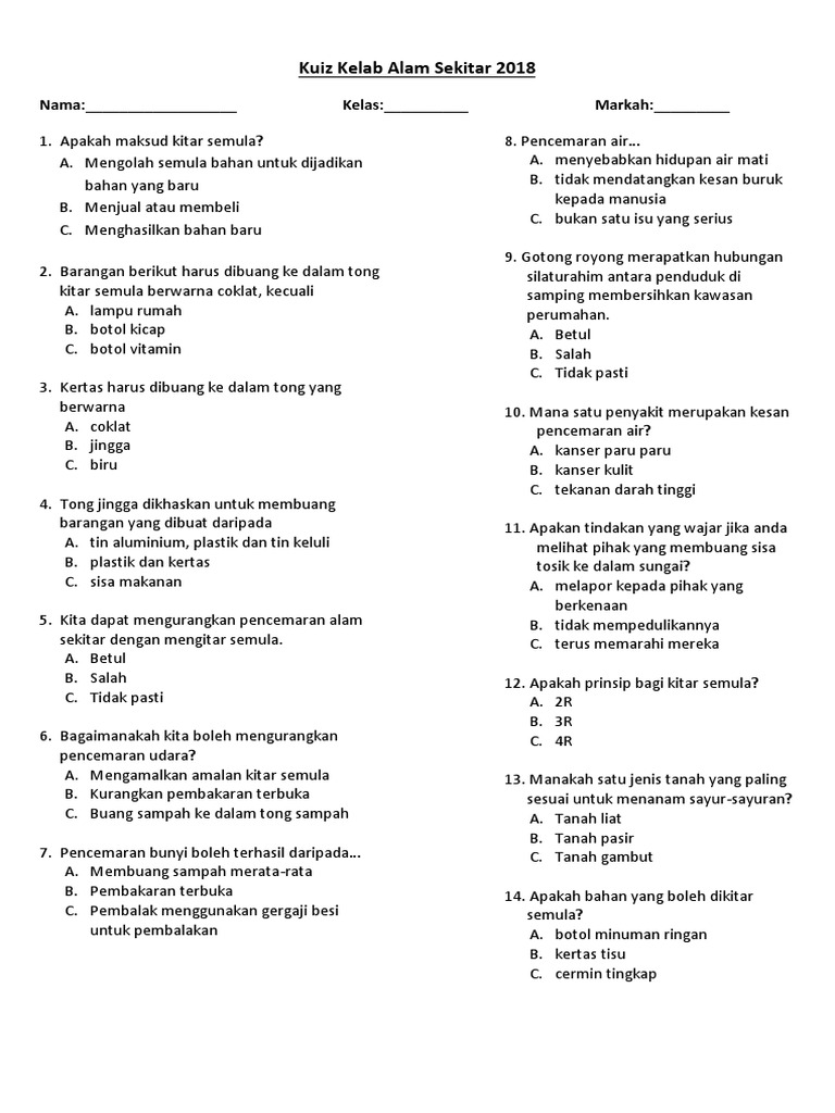 Soalan Kuiz Kelab Alam Sekitar