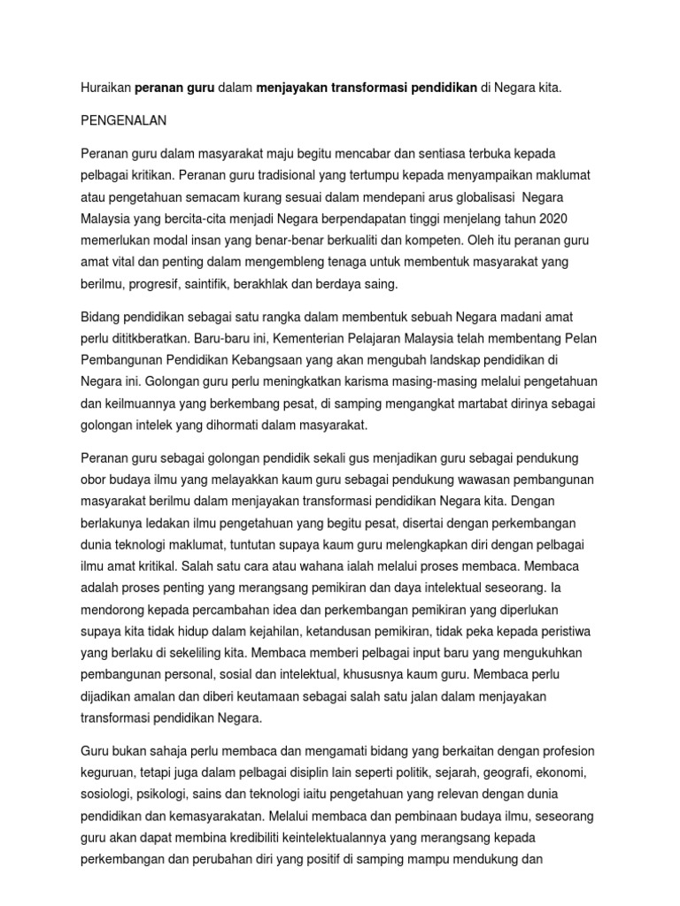 Huraikan Peranan Guru Dalam Menjayakan Transformasi Pendidikan Di Negara Kita