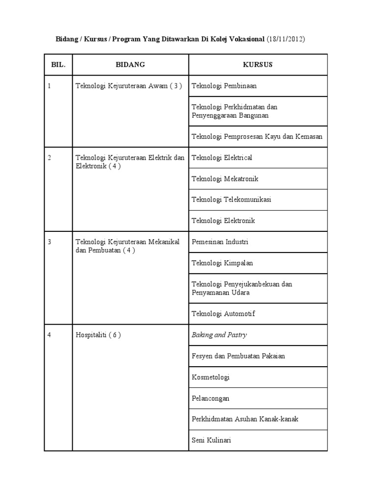 Senarai Kv Dan Kursus Yang Ditawarkan Di Kolej Vokasional