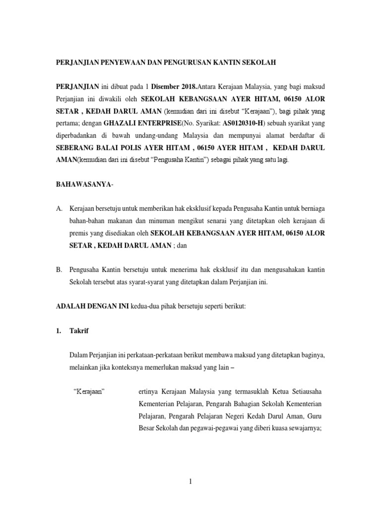 Perjanjian Penyewaan Dan Pengurusan Kantin Sekolah Perjanjian Ini Dibuat Pada Tarikh Semasa
