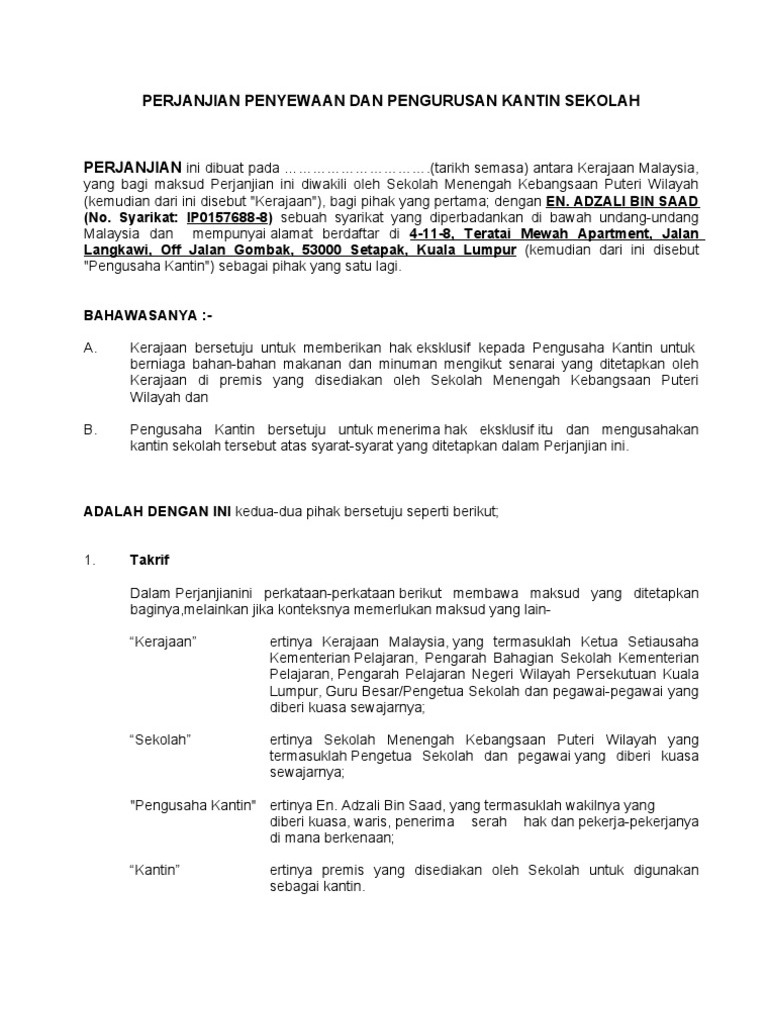 Perjanjian Penyewaan Dan Pengurusan Kantin Sekolah