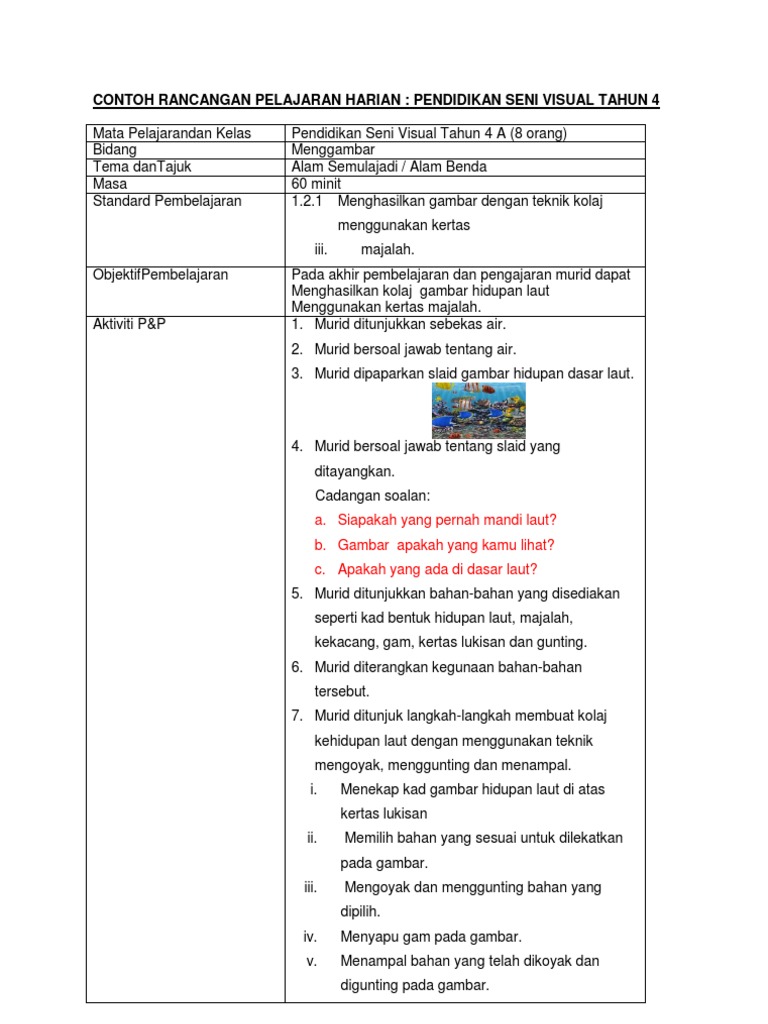 Psv Rancangan Pengajaran Harian Kssr Seni Tahun 4