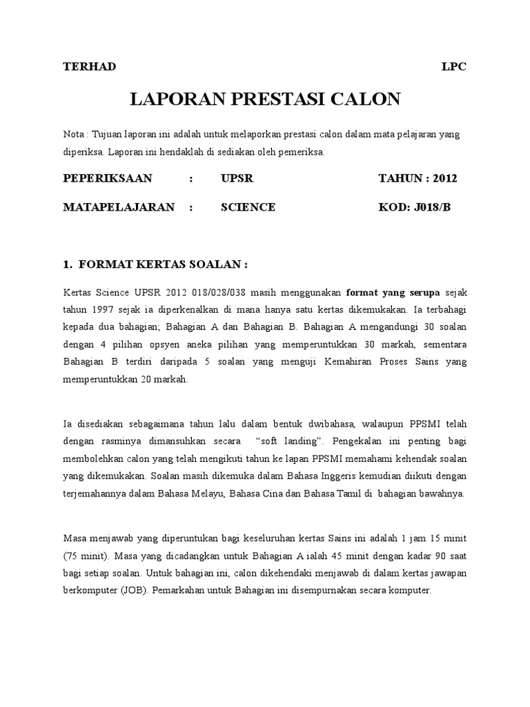 Laporan Prestasi Calon Kertas Science Upsr 2012 018 028 038 Doc